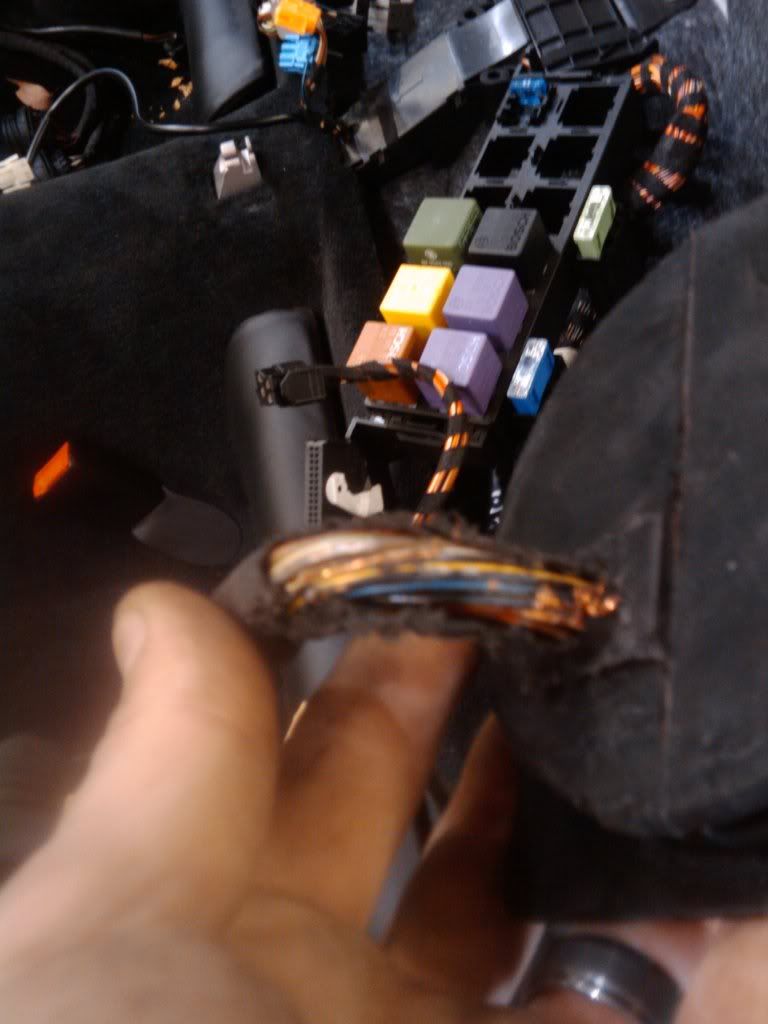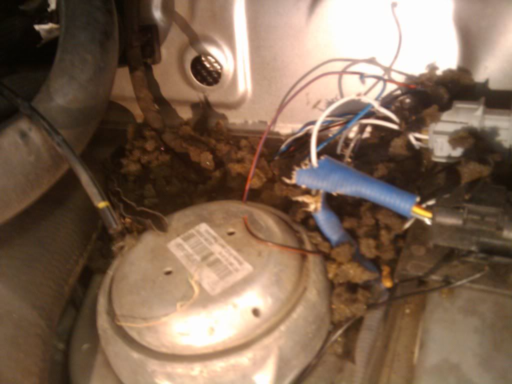 I said everything aft of the dash didn't I. The reason the dash came out was this.  This is under the cowl panel where he made his way into the car.