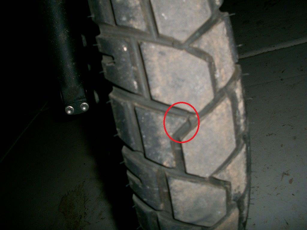 In case you can't tell, this is the front tire and the worn points are the pointy bits in between the big blocks.  It makes for some peculiar handling characteristics that I don't really appreciate. The OEM tires did something similar which I initially blamed on poor fork brace installation.  The rear tire shows no abnormal wear.